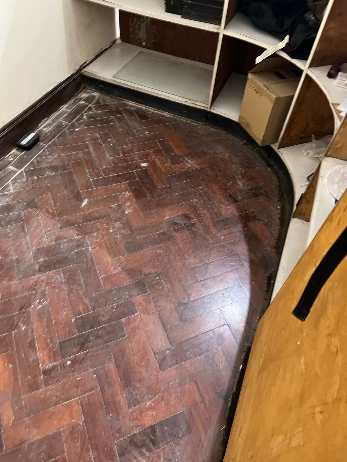 Covent Garden properties come with their surprises. This ground-floor flat on WC2N had original herringbone parquet going back to the 1950s — most of it solid, a few loose blocks, and a surface that hadn't been touched in years. The client wanted it restored, not replaced.